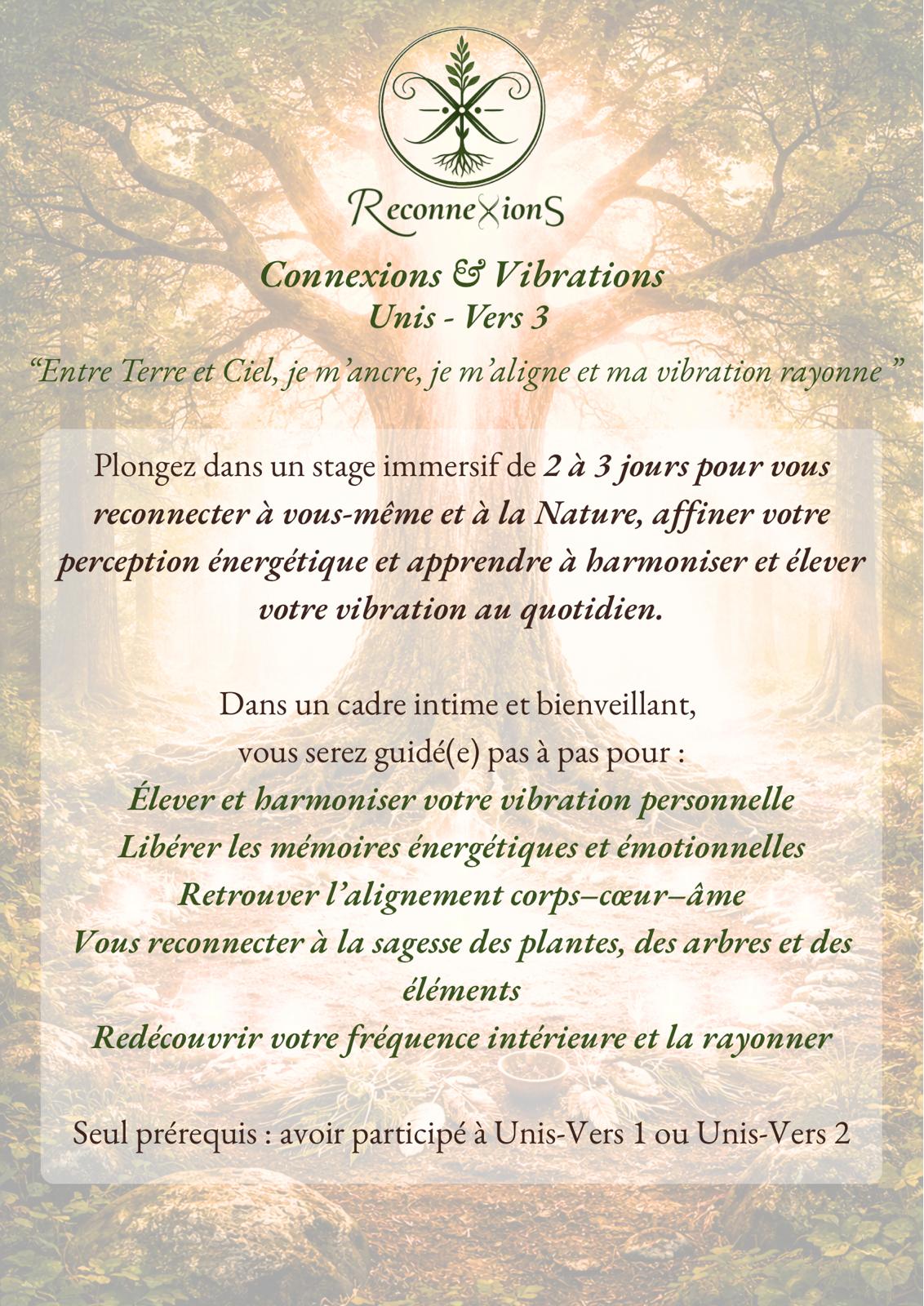 Dans un cadre simple et naturel, tu seras guidé·e pour affiner ta perception vibratoire, entrer en relation subtile avec les élémentaires, et élever ta vibration en conscience.